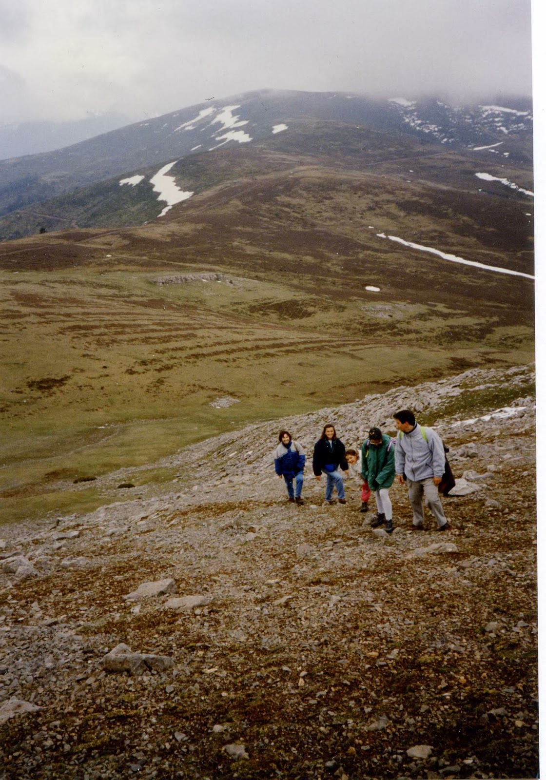 Ideal para iniciar a los peques en el monte o ir en familia, el Cabezo del Santo es una protuberancia muy curiosa en medio del marasmo de valles y lomas del Camero Nuevo. Fuimos allí en 7 de abril de 1996 invitados por Ernesto Reiner, y es un placer escanear las fotos y animar a hacer o repetir esta bonita salida montañera que no tiene pérdida: se deja el coche en el puerto de Peña Hincada (1.412 m), se echa a andar por la pista que sale en dirección sur y que va más o menos a cota o ascendiendo suavemente hasta ver la mole del Cabezo al fondo a la derecha. Y cuando se llega debajo del cono final de piedra (5 km desde la salida), pues para arriba (1.854). En total 6,5 km y 442 m de ascensión. La última parte de la subida sobre pedruscos sueltos tiene incluso sabor de alta montaña. O sea que, ideal para que la chiquillería se vaya haciendo una idea de lo que hay por allí arriba.